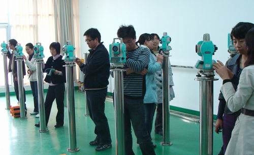 许老师通过多媒体用模拟器进行了理论讲解,并对尼康、索佳、拓普康等6种不同品牌与型号的全站仪进行实际操作讲授。在实际操作练习中,教师们基本掌握了全站仪的使用方法,综合技能水平得到了很大提高。