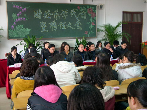 31上午,财经系2009届学生干部聘任大会在JX6203隆重召开,院团委书记周志琦、财经系党总支书记张玉姣、系主任张辉、副书记宋建涛、副主任梁建民等领导及部分老师参加了此次聘任大会。