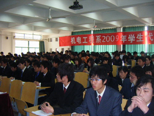 37,经过紧张而精心的筹备,机电系2009年学生代表大会在教学楼6302隆重召开。出席此次学生代表大会的有院团委书记周志琦,院学生处副处长李响,机电系党总支书记万书栋、副书记庞子瑞,机电系分团委书记薛冰及机电系全体辅导员。