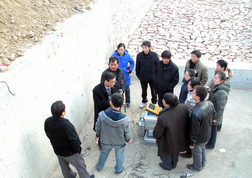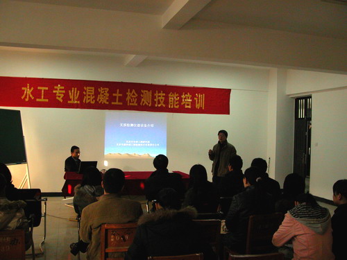 128下午,康科瑞公司的检测工程师对培训教师进行各种检测项目的检测设备和检测原理讲解,然后到新校区在建的水工建筑物仿真实训基地进行现场混凝土检测示范,并由参加培训的教师进行了实际检测操作。