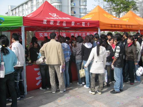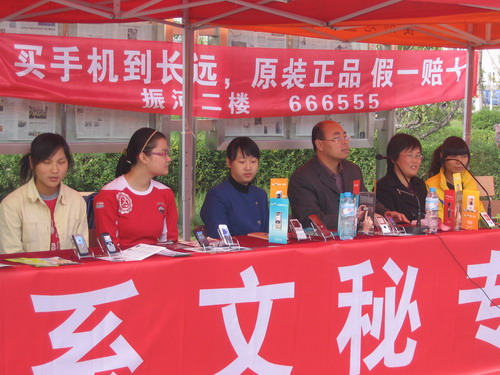 1024,管理系组织06级文秘专业学生联合开封市长远手机商场,在我院青年大道举办了一场别开生面的“时尚•手机”会展实训宣传活动。管理系党总支书记彭新立到场指导。