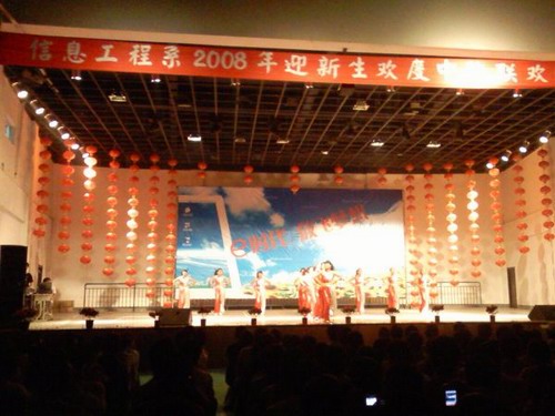 916日晚,信息工程系2008年迎新生欢度中秋联欢晚会在新校区风雨球场隆重举行。信息工程系党总支书记何聚坤、系主任丁爱萍、系党总支副书记殷莺、各年级辅导员与信息系全体08级新生一同观看了演出。