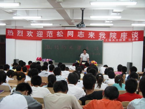 报告内容分为五个部分:我们为什么上大学;上大学到底学什么;如何过好几年大学;如何取得成功;什么是真爱,大学生如何应对爱情问题。范松结合自己的工作经历特别提醒大家,大学里最重要的是要学好专业技能。整个讲座气氛十分融洽,同学们纷纷向范松提出自己在学习、生活、工作等各方面所遇到的问题,范松以精彩的回答,博得大家的热烈掌声。
