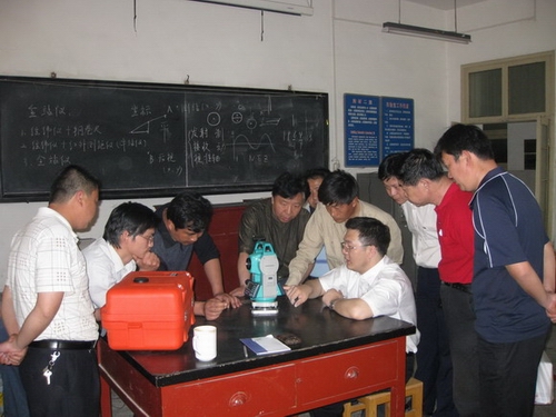 仪器供应商派出技术人员,全面讲解全站仪的基本用途、操作中注意事项、全站仪工作原理、全站仪实践操作要领等内容。听课的教师非常认真,对讲解的内容进行了详细记录,对不懂的问题,向技术人员虚心求教。培训结束后,参加学习的教师还进行了实地操作,检验学习培训的成果。