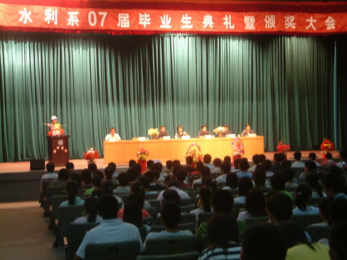 6月20日晚7点,水利系在东院大礼堂隆重举行了2007届毕业生毕业典礼。院副院长刘紫婷、院团委书记菅浩然、学生处副处长陈志强应邀出席,水利系领导来卫东、刘纯义、焦爱萍及07届全体毕业生参加典礼。。