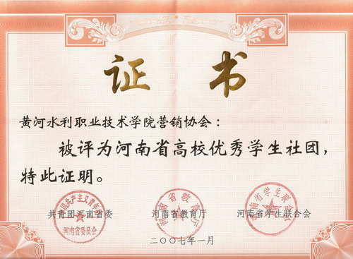 在院团委和管理系的大力支持和精心指导下,经过院社团联合部和院市场营销协会的不断努力,我院市场营销协会于20071月成功申报成为河南省“优秀学生社团”。