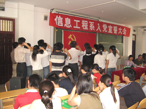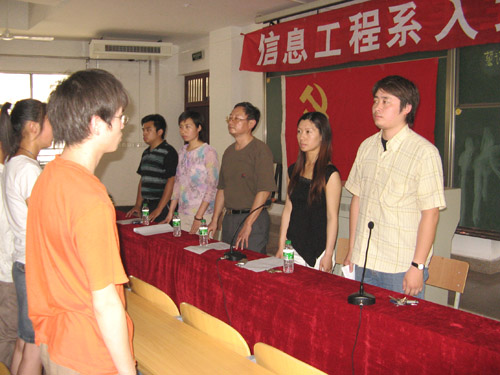 仪式中,信息系党总支副书记殷莺宣布了王荣正等20多名预备党员的名单。在组织委员吴丰带领下,预备党员面对党旗庄严宣誓。宣誓完毕,学生党员杜新娜代表当天宣誓的预备党员发言。信息系党总支书记吕来在讲话中鼓励全系入党积极分子要积极向党组织*拢,努力创造条件争取早日加入党组织。他希望已经入党的同学要戒骄戒躁,树立良好的党员形象,努力学习科学文化知识,发挥党员的先锋模范作用。
