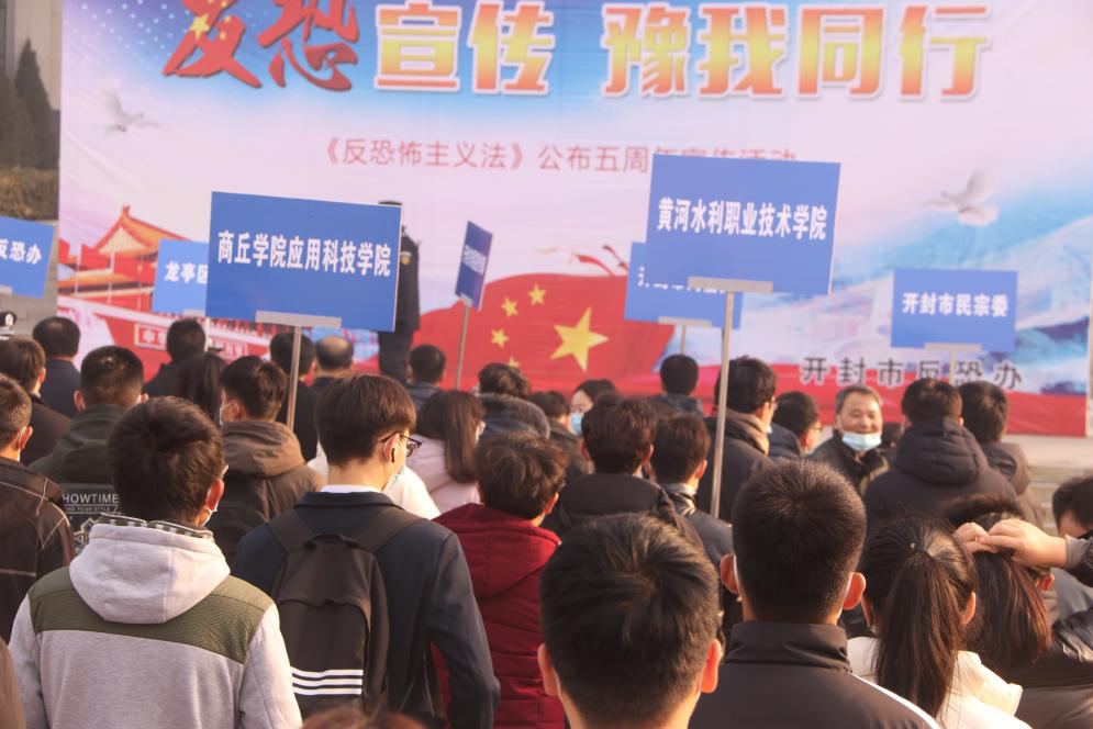 12月27日,开封市“反恐怖宣传教育进校园”活动启动仪式在河南大学金明校区图书馆广场举行,我校保卫处人员带领水利工程学院部分师生代表参加此次活动。