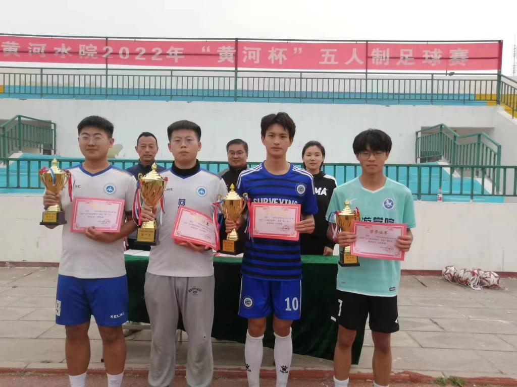在各学院积极参与和大力支持下,进行了为期10天、共计16场的比赛,足球健儿们在“绿茵”场上展开激烈的比拼,他们奋勇拼搏,精彩的传球、运球、射门等动作赢得了阵阵欢呼声。缤纷的队服、自信的笑容、铿锵的步伐,彰显了黄河水院学子的激情活力和健康向上的精神风貌。通过小组赛循环、交叉淘汰,最终水利工程学院、测绘工程学院、水利工程学院2队、旅游学院分获比赛前四名。水利工程学院罗昊同学以14粒进球获得最佳射手荣誉,水利工程学院吴德林同学获得最佳守门员奖。赛后,在足球场举行了闭幕式,并为获奖球队进行了颁奖。