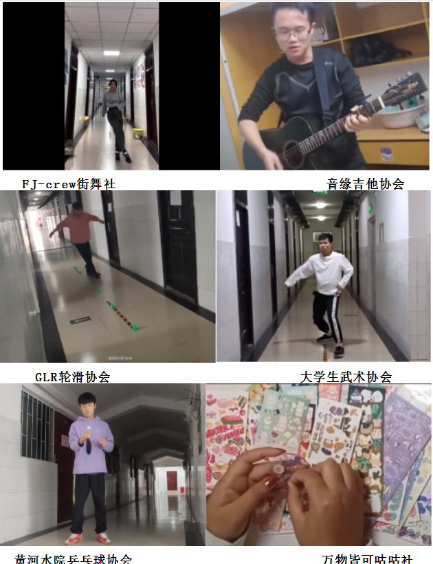 活动中,FJ-crew街舞社的社员伴着音乐,一脚一个节拍,舞出青春与活力;音缘吉他协会用优美动听的歌声唱出了内心世界,弹出心中音乐;GLR轮滑协会的社员脚下轮子飞转,飘逸的身姿幻化成美丽的弧线,在狭窄的空间中展现大舞台的风采;大学生武术协会的社员展示中华传统武术,拳脚交错之间是武者的精彩;乒乓球协会社员的一拍一扣,使乒乓球在腾移跃动时划出青春的轨迹;足球社炫酷的花式足球一踢一垫,尽展技巧;垂聆相声社动听的传统豫剧更是让人沉浸其中。