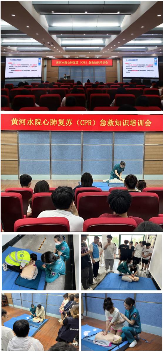 本次培训主要采取理论指导、模拟演练与现场互动相结合的方式进行培训教学。在理论指导环节,主讲医护魏鸣老师结合大量临床实例,利用PPT、图片、视频等深入浅出地向同学们介绍了学习心肺复苏的意义及基本常识,重点强调急救程序与技术要领——如人工呼吸法、如何判断患者意识,急救手法操作要领及判断心肺复苏成功的标志等。模拟演练环节,医护人员通过对“模拟人”实施心脏复苏抢救操作进行了演示,包括判断是否丧失意识、有无自主呼吸、有无脉搏,进行胸外心脏按压、清理口腔异物、开放气道、人工呼吸等操作要领的示范。随后,在医护人员的指导下,学生共分为4组分别在人体模型上进行心肺复苏实操练习,并逐一进行讲解与指导。水利工程学院刘润东表示:“通过心肺复苏(CPR)急救专业知识的培训,提高我们应对突发事件的能力,帮助我们掌握心肺复苏技能,如果未来我们遇到因心脏骤停而产生的突发紧急情况,能够在黄金救援4分钟进行施救,提高挽救更多生命的概率,这是一次很有意义的培训,希望能够有机会再次进行培训与练习。”
