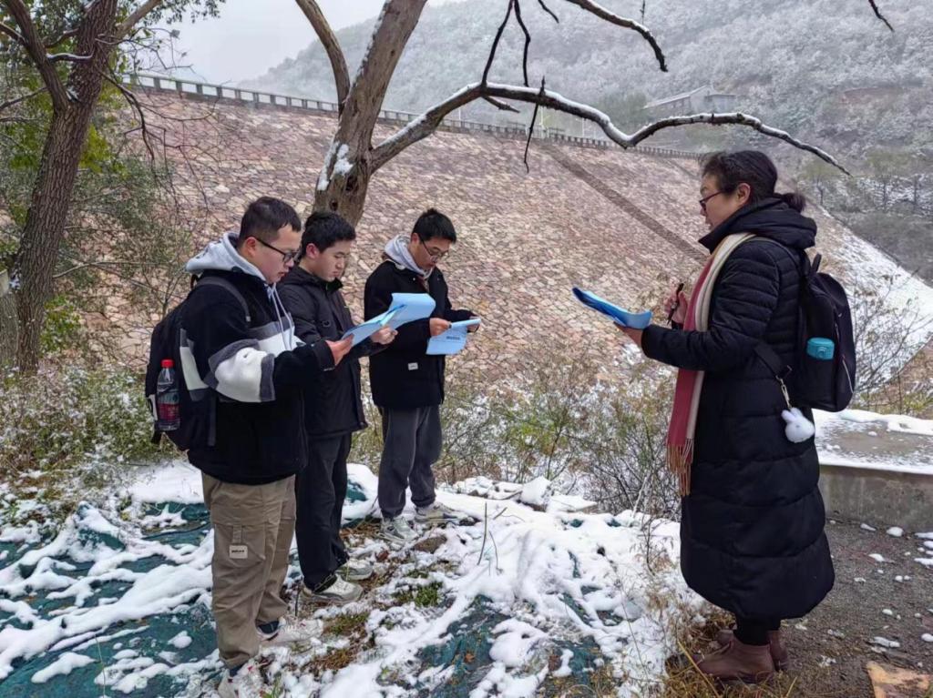 寒风凛冽,热情不减。师生团队踏访白家庄空心坝、南谷洞水库、渠首拦河坝,观摩蜿蜒曲折、巧夺天工的“水长城”“团结洞”“创业洞”等地标建筑,以设计图纸对照实际工程,知行合一,对工程结构有了深入了解。在红旗渠咽喉工程“青年洞”,走在峭壁下的红旗渠畔,看着悬崖上修渠人一锤一钎凿出的山洞,师生在此读懂了修渠人“劈开太行山,漳河穿山来”的战天斗地事迹,切实感受了引漳入林的艰难,更感受到了建设者们当年的决心和雄心。