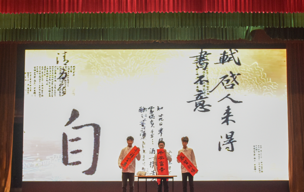 演出在热闹欢腾的《扇舞华章》开场舞中拉开了序幕。歌舞剧《同桌的你》,细数了青葱岁月同学间的纯纯友谊;歌曲串烧《音梦交织庆华年》,温柔的旋律,深情的演唱,让听众们感受到了丝丝感动和温情;教师丁晓婷带来的独舞《美人关》,动作细腻典雅,充分展现了中国舞的独特艺术魅力;教师胡宇涵演唱的英文歌曲《My heart will go on》,婉转动听,展现了国际风采;由分团委书记曹睿、教师胡宇涵与学生合唱的歌曲《隐形的翅膀》,展示了学院师生热心公益开展志愿服务的靓影,温暖的歌声中承载着满满的爱与关怀;留学生们也展示了学习豫剧的成果,演唱了豫剧《花木兰》选段,字字铿锵有力,唱响了“豫之音”,赢得了在场师生的阵阵掌声;在《书韵流芳庆新年》节目中,学生挥毫书写新年祝福,展现中华书法文化魅力;在同学们《青春颂国》的朗诵和《歌唱祖国》的大合唱中,观众们感受到了青年学子们荡气回肠的爱国深情和青春壮志。