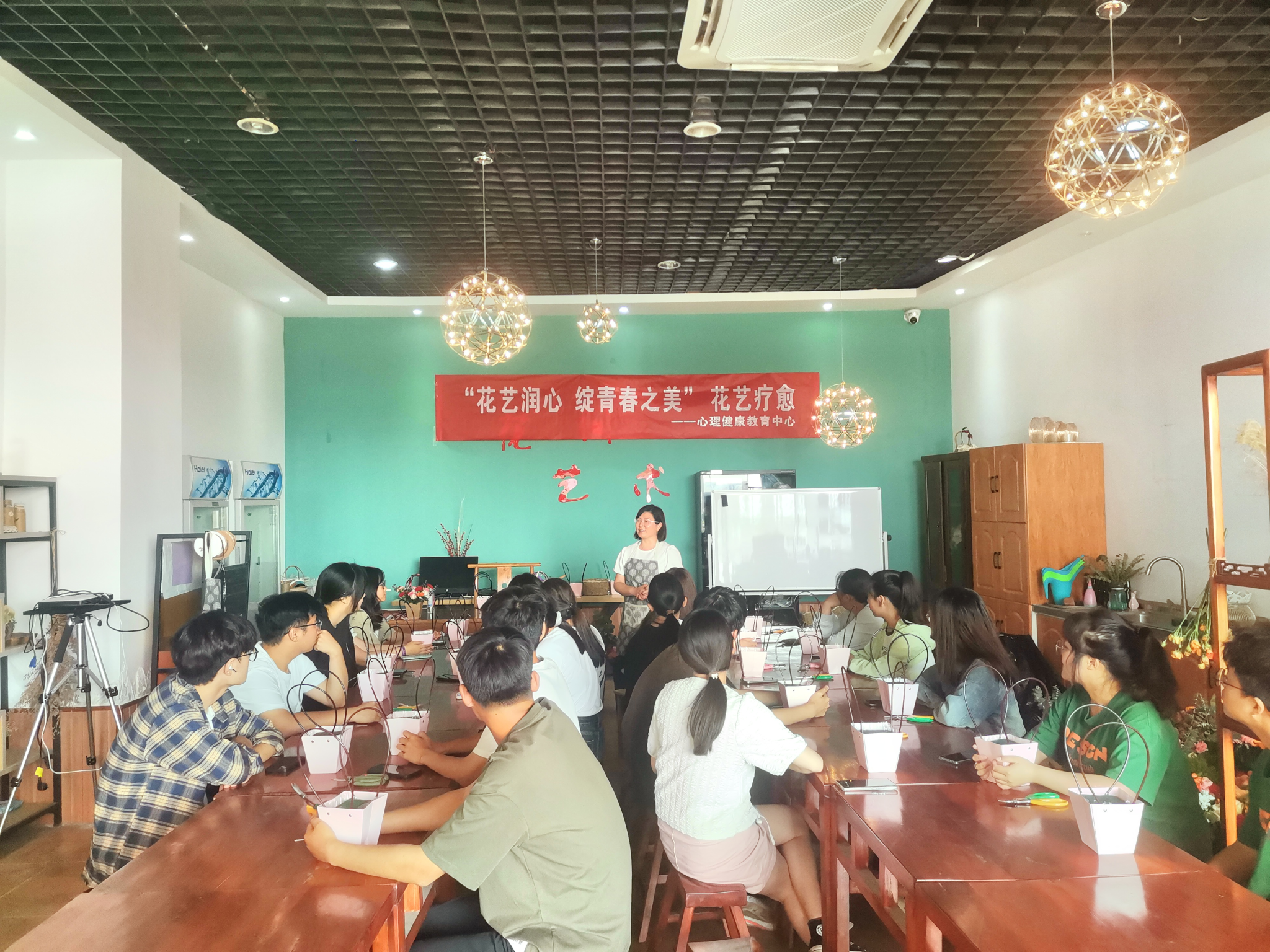 为推进五育并举,提升学生美育素养,减压舒缓,疗愈身心,陶冶心灵,5月28日,心理健康教育中心特邀旅游学院花艺教师卫聪聪为同学们带来一场花的疗愈,30余名学生参与活动。
