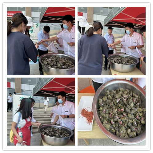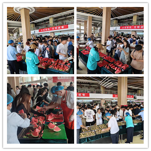 活动现场通过趣味答题的方式为师生免费发放粽子、香囊和彩绳,还为在餐厅就餐的同学们准备了解暑的西瓜。师生们有序排队,感受浓浓的关爱和节日气氛,纷纷为后勤的服务点赞。本次活动共计发放粽子3000个、西瓜1000斤。