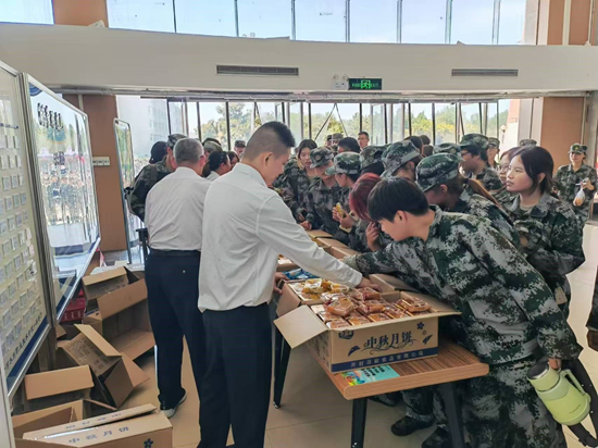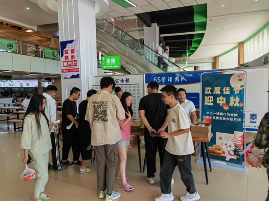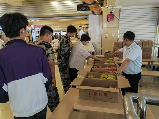 在学校餐厅,学校工作人员早早地做好了准备。一块块包装精美的月饼整整齐齐地摆放着,所有在中秋节当天去食堂就餐的师生都可以免费领取。月饼品种多样,口味丰富,饱含着学校对同学们的深切祝福。同学们有序地排队领取,脸上满是喜悦,小小的月饼传递着大大的温暖,让远离家乡的学子们在这个特别的节日里心里多了一份慰藉。