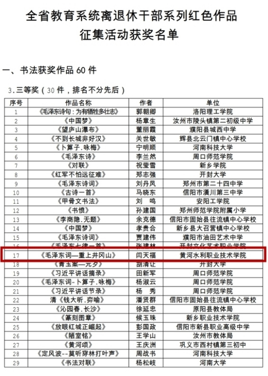 4月至8月,河南省教育厅在全省教育系统中开展离退休干部系列红色作品征集活动。活动开展以来,我校离退处在老同志中广泛宣传、组织前期培训、认真备赛,最终共征集到参赛作品300余幅,后组织专家评审向教育厅推荐50幅作品。作品集中展示了我校老同志对以习近平同志为核心的党中央的衷心拥护,对全面建设社会主义现代化新河南的热切期盼,对推动河南教育发展关心关注的赤诚情怀。