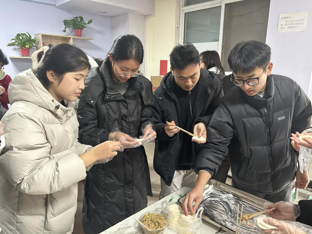 远离家乡的学子们齐聚一堂,大家一起动手包饺子,气氛热闹而温馨,冲淡了许多思乡的愁绪。活动现场,同学们组成小队,摩拳擦掌、跃跃欲试,有的同学手法娴熟,一捏一挤,饱满的饺子瞬间成型;有的则略显生疏,在老师的耐心指导下逐渐掌握窍门,从手忙脚乱到渐入佳境,创意百出的饺子造型更是成为本次活动的亮点,有圆滚滚的“胖墩饺”,还有褶子精致的“花边饺”,大家一边包饺子,一边聊天,分享着冬至的传统习俗和各地的过节方式,现场充满了欢声笑语。