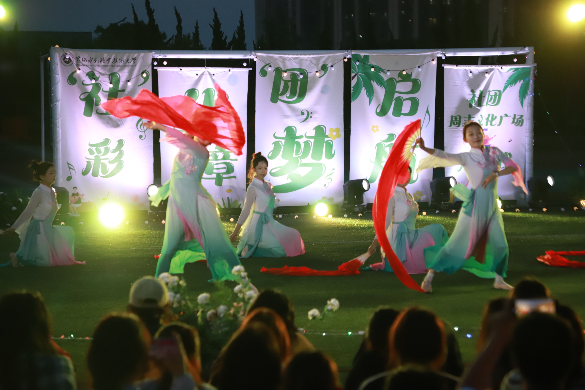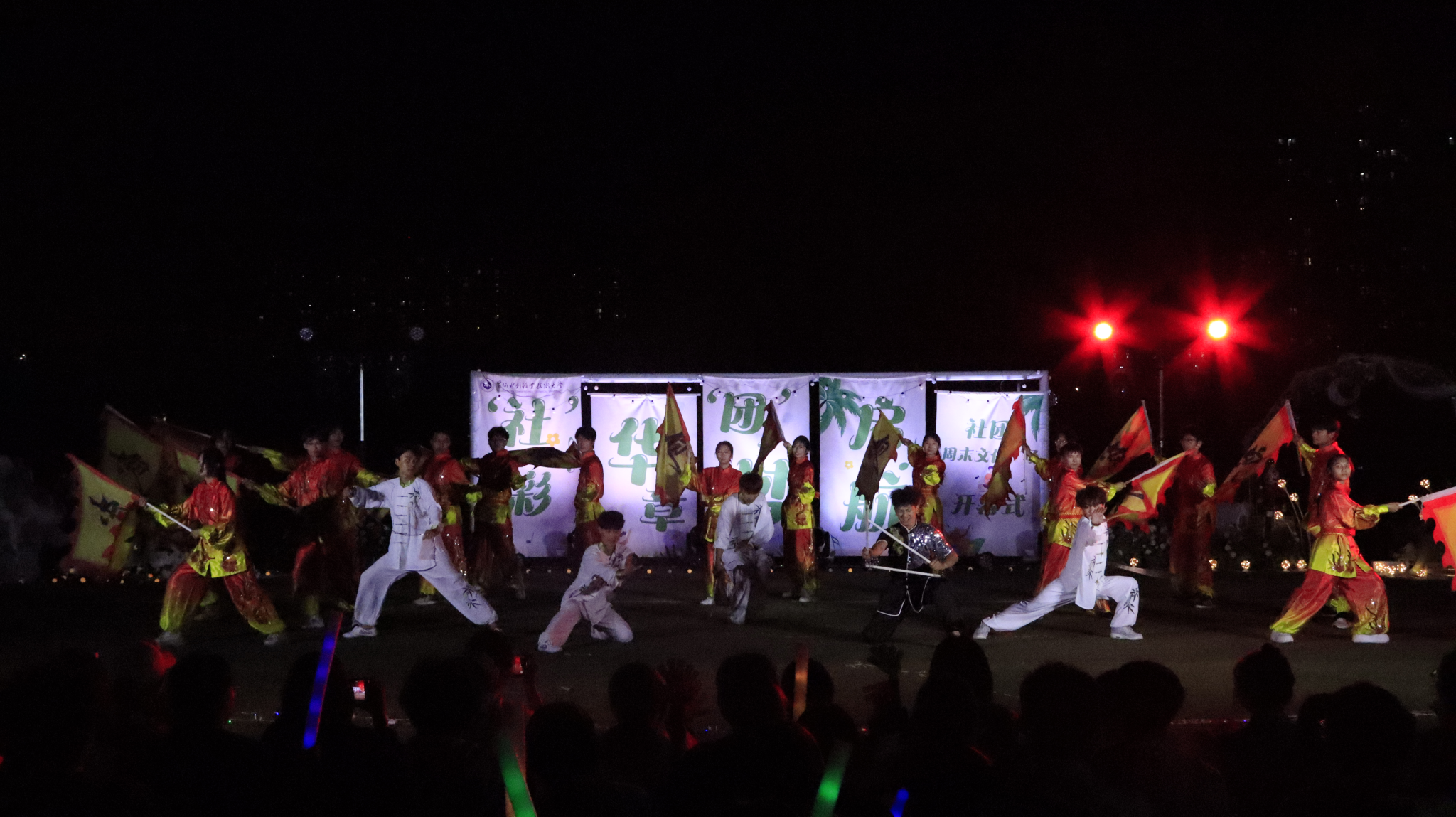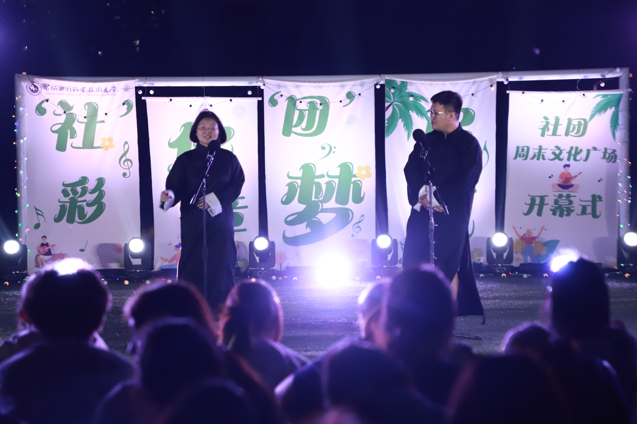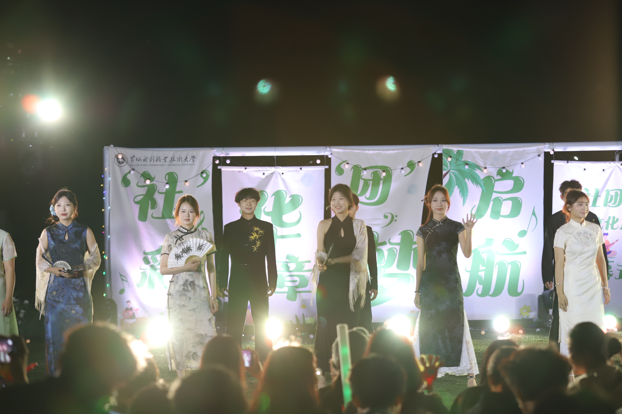 整场演出在大学生艺术团《扇舞九州》的唯美演绎中拉开帷幕,舞者们手持彩扇翩然起舞,以灵动身姿展现中华传统艺术的典雅风韵;国际教育学院留学生嘉娜以独特声线重新诠释经典歌曲《我的歌声里》,为舞台增添别样魅力;垂怜相声社《对春联》妙语连珠,传统曲艺与现代幽默碰撞出欢乐火花;艺术与设计学院社联分会《龙腾虎跃》以恢宏阵势展现民族气魄,鼓点铿锵震撼人心;FJ-crew街舞社带来的《坠入璀璨星河》用充满张力的舞步点燃全场激情;声乐队《时光絮语》的温暖旋律唤起青春共鸣;扬琴独奏《喜讯》琴弦轻颤,奏响欢快乐章;武术协会《赤旗武韵》刚柔并济,一招一式尽显武者风范;礼仪队《古韵风华》通过端庄仪态演绎东方美学精髓;开封文化艺术职业学院和开封大学带来的拉丁舞《恰恰恰》和传统文化展演《狮舞祥瑞》更增进了兄弟院校间的友谊。最后,由尤克里里社团带来的《晴天》引发全场大合唱,观众席手机灯光秀与舞台遥相呼应,如星河闪耀,将气氛推向最高潮。