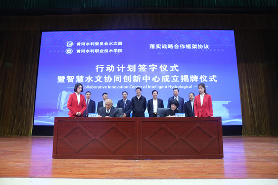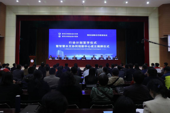 11月2日,黄河水利职业技术学院(以下简称“黄河水院”)与水利部黄河水利委员会(以下简称“黄委”)水文局共建的“智慧水文协同创新中心”(以下简称“中心”)签约揭牌仪式,在学生活动中心报告厅举行。中国水利教育协会会长黄河,河南省教育厅副巡视员李金川,黄河水利委员会水文局局长谷源泽、党组书记贺树明,河南省教育厅科技处正处级调研员杨学勇,黄河水文科技有限公司董事长、总经理张永平,黄河水院党委书记许琰,党委副书记、校长祝玉华,副校长杨士恒,党委副书记刘卫锋,副校长焦爱萍等出席签约揭牌仪式,黄委水文局相关部门负责人、学校全体中层干部及水利工程学院部分师生代表参加仪式,仪式由焦爱萍主持。