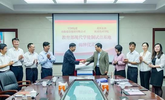 徐德阳、许琰分别代表双方为合作项目工程测量技术专业“教育部现代学徒制试点基地”揭牌。徐德阳、祝玉华分别代表双方签署校企战略合作框架协议。