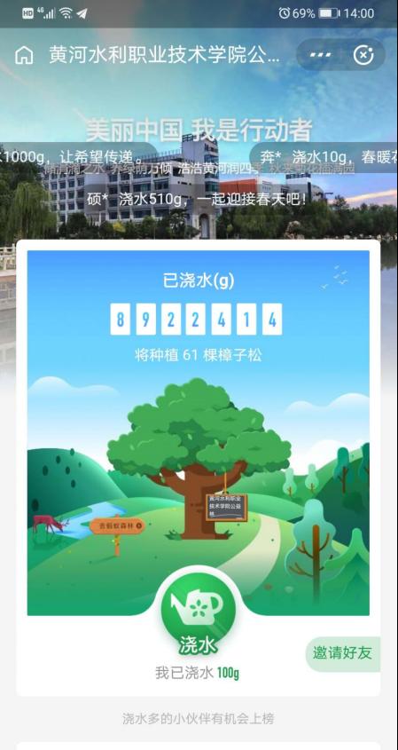 此次活动得到了全校师生的积极响应,大家踊跃投入到线上植树活动中,为“黄河水利职业技术学院公益林”浇水助力,为绿化做出自己的贡献,还通过微信、QQ、朋友圈等媒介积极转发活动信息,并晒出浇水截图。根据蚂蚁森林数据统计,3月12日植树节当天,我校总浇水量在全国高校排行榜排名第三。截至13日14时,我校公益林已经积攒了8922414克能量,可以种植61棵樟子松。
