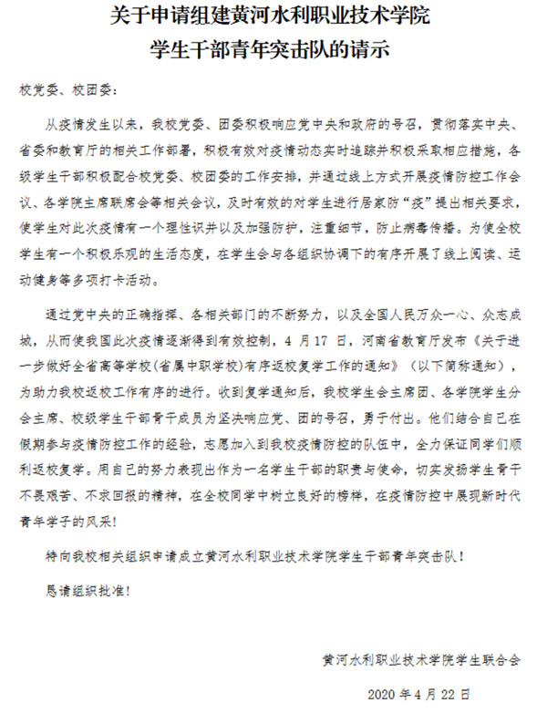 河南省教育厅发布返校复学通知后,黄河水利职业技术学院(以下简称黄河水院)学子也挺身而出,学生干部率先垂范,他们动向校学生会递交请战书,希望加入学校疫情防控的工作队伍中;校学生会向校党委、校团委请战,申请成立黄河水利职业技术学院学生干部青年突击队,以实际行动助力返校复学工作顺利开展。