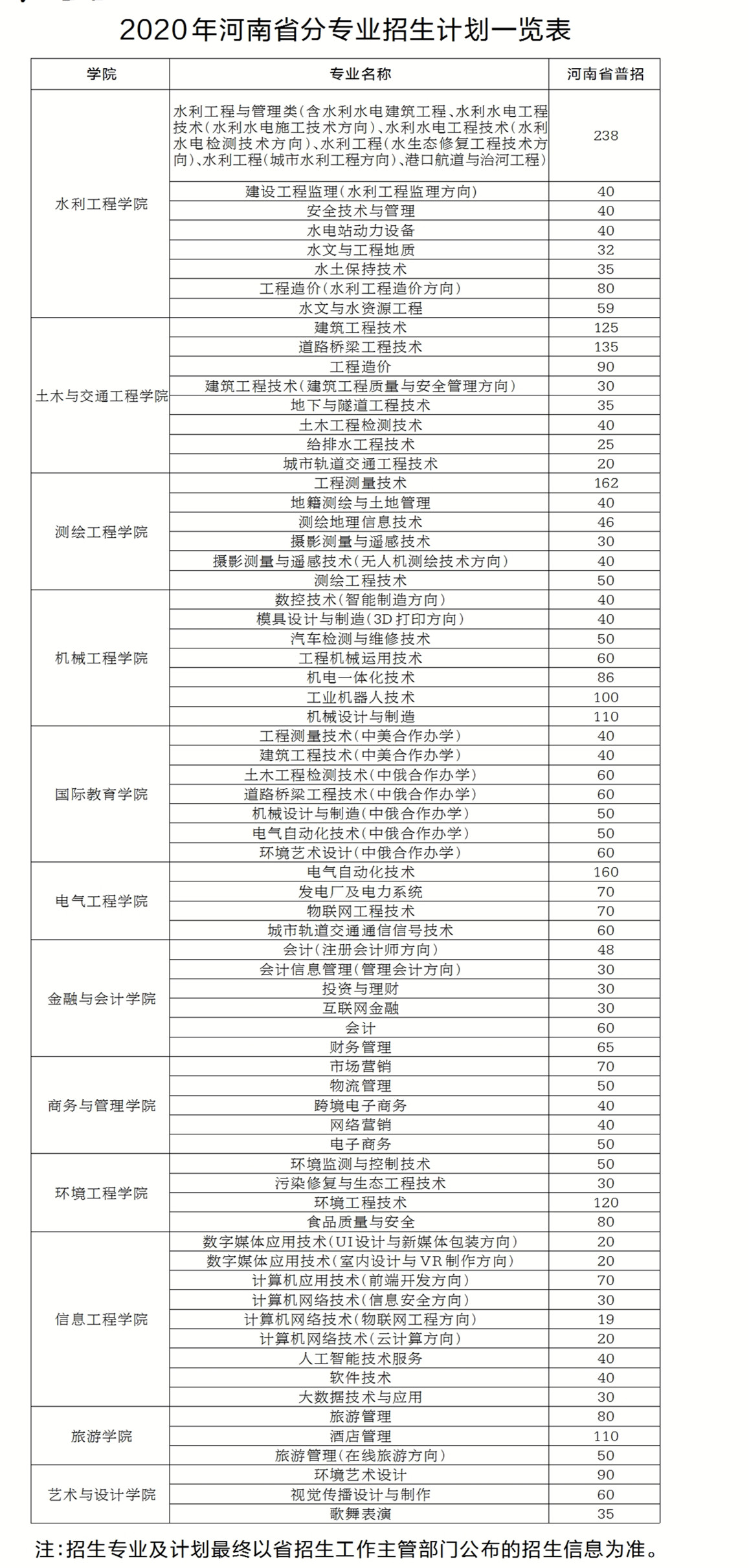 教育理念先进,育人成效显著。学校以培养高素质技术技能人才为目标,坚持“以就业为导向,以教学为中心,以专业建设为核心,教书育人,管理育人,服务育人,生产育人”的教育理念,实现学生的知识、能力、素质、个性协调发展。学校设有17个学院(部),开设水利、测量、土木、路桥、机电、机器人、大数据、跨境电商等61个专业及方向。拥有中国特色高水平专业群2个,国家级精品专业1个,国家级教学改革试点专业2个,国家重点建设专业10个,省级示范、综合改革试点等重点专业12个。拥有国家级专业教学资源库2个,国家级精品资源共享课程13门,国家级精品在线开放课程4门,省级精品在线开放课程16门。学校是国家级教学诊断与改进试点院校之一,有5个国家级现代学徒制试点专业,获国家级教学成果奖二等奖5项。近三年,学生在各类职业技能大赛中获得省部级以上奖项780余项。其中,获得世界级团体奖项3项、国家级团体奖项136项、省部级团体奖256项。“工程测量”国赛连续7次获得一等奖,先进成图技术与产品信息建模创新大赛十次斩获全国冠军。毕业生就业率连年保持在98%以上,实现毕业生就业率高、就业质量高,学生满意度高、用人单位满意度高的“四高效果”,毕业生就业竞争力位居河南省高职高专院校第一名。