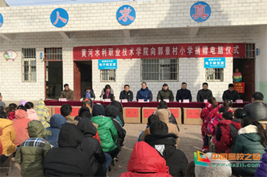 仪式上,黄河水利职业技术学院捐赠了45台电脑及桌椅等配套设备,总价值21.5万元,援建郭景村小学电子阅览室。