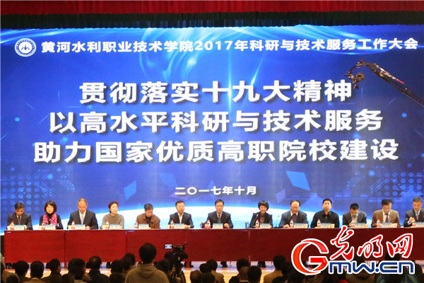 河南省教育厅科技处正处级调研员杨学勇、黄河水利委员会国际合作与科技局局长尚宏琦先后讲话。他们对该校的办学条件、办学特色、人才培养质量给予了高度评价,对该校近几年科研和技术服务工作所取得的成绩给予充分的肯定,希望该校继续发挥办学优势,开拓创新,努力进取,实现学校科研与技术服务工作跨越式发展,充分发挥在高职教育的示范引领作用。