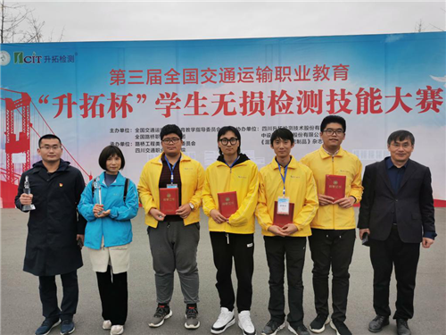 近日,由全国交通运输职业教育教学指导委员会、全国路桥职业教育集团主办,四川交通职业技术学院承办的第三届全国交通运输职业教育“升拓杯”学生无损检测技能大赛在成都举行。黄河水利职业技术学院土木与交通工程学院吕新娓、孟宪金老师指导的团队从160支代表队中脱颖而出,道路桥梁专业学生高凯源、潘振卓不畏强手,沉着冷静,精心操作,荣获团体一等奖。在本次比赛中,我校还获得单项一等奖2项,单项二等奖5项,团体三等奖1项,单项三等奖1项;吕新娓老师被授予“优秀指导教师奖”。