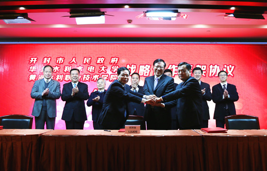 1220日上午,黄河水利职业技术学院与开封市政府、华北水利水电大学三方战略性合作框架协议签字仪式在开封市中州国际饭店签订。开封市市委书记吉炳伟,市委副书记黄道功,市委常委、常务副市长秦保强,市委常委、秘书长付磊;华北水利水电大学党委书记王清义,党委副书记、校长刘文锴,;黄河水利职业技术学院党委书记许琰等出席签字仪式。仪式由付磊秘书长主持。