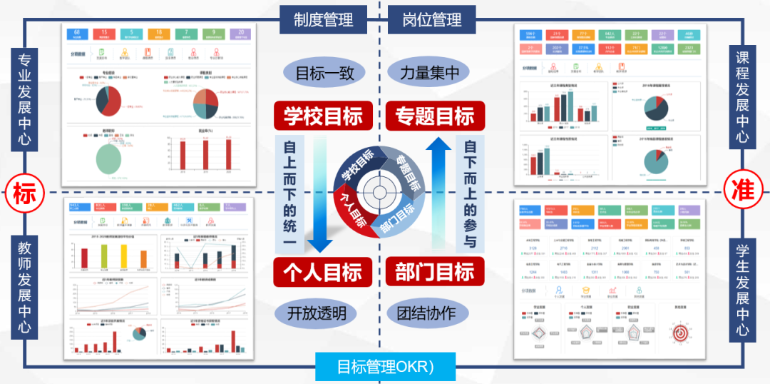 结合制度和岗位信息化管理打造标准链,通过将目标管理(OKR)作为8字螺旋13个节点的信息化驱动引擎,驱动学校目标、专项目标、部门目标、个人(教师和学生)目标信息化、流程化、数据化、轨迹化,并对目标进行监控、调整、改进和调整。