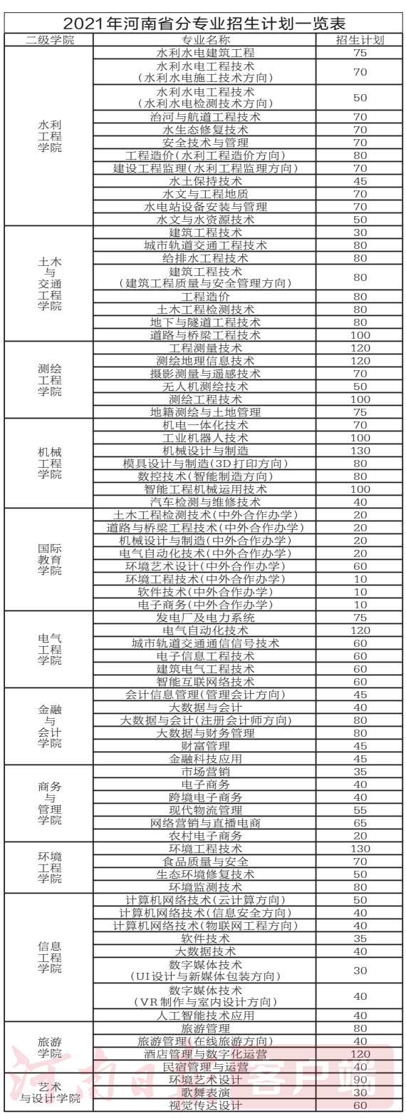 教育理念先进,育人成效显著。学校以培养高素质技术技能人才为目标,坚持“以就业为导向,以教学为中心,以专业建设为核心,教书育人,管理育人,服务育人,生产育人”的教育理念,实现学生的知识、能力、素质、个性协调发展。学校设有17个学院(部),开设水利、测量、土木、路桥、机电、机器人、大数据、跨境电商等61个专业。拥有中国特色高水平专业群2个,国家级精品专业1个,国家级教学改革试点专业2个,国家重点建设专业10个,省级重点、特色、骨干、综合改革试点等专业23个。拥有国家级专业教学资源库2个,国家级精品资源共享课程13门,国家级精品在线开放课程4门,省级精品在线开放课程16门。学校是国家级教学诊断与改进试点院校之一,有5个国家级现代学徒制试点专业,获国家级教学成果奖二等奖5项。近三年,学生在各类职业技能大赛中获得省部级以上奖项780余项。其中,获得世界级团体奖项3项、国家级团体奖项136项、省部级团体奖256项。“工程测量”国赛连续7次获得一等奖,先进成图技术与产品信息建模创新大赛十次斩获全国冠军。毕业生就业率连年保持在98%以上,毕业生就业竞争力位居河南省高职高专院校第一名。