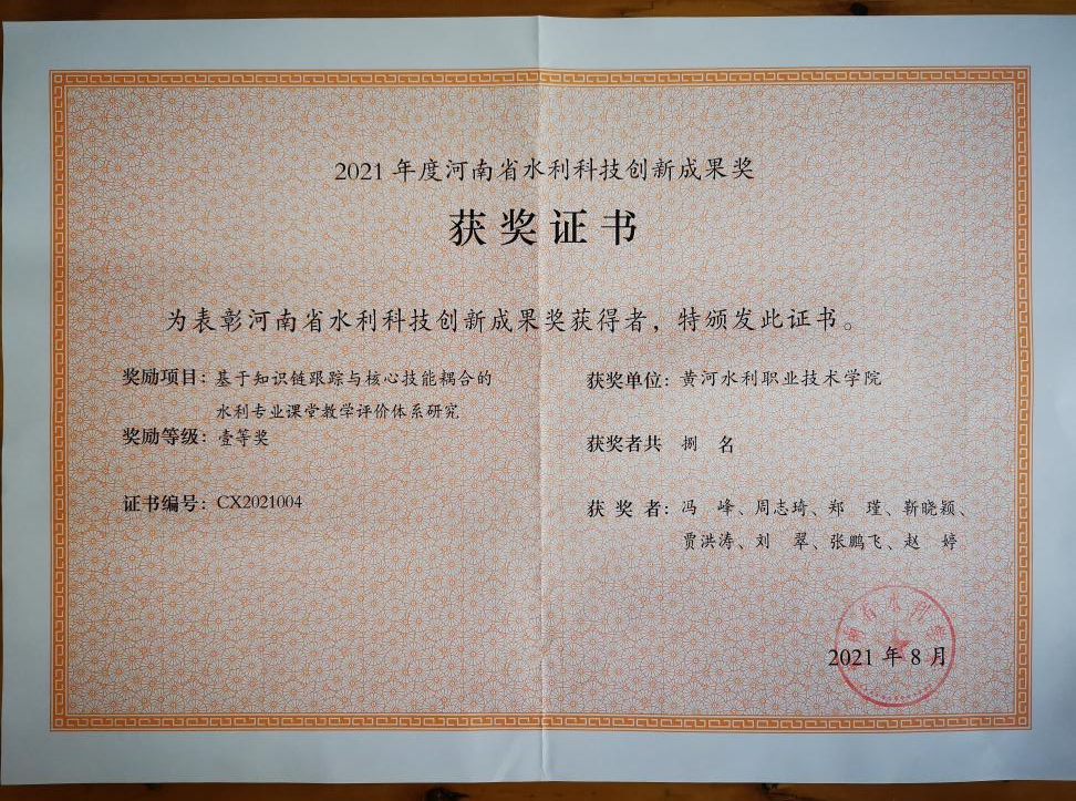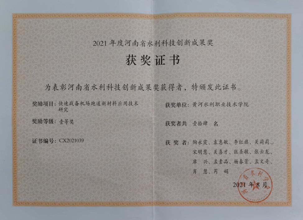 近日,河南省水利学会发布《关于公布2021年度河南省水利科技创新成果获奖名单的通知》(豫水学〔2021〕18号),我校陶永霞教授主持申报的《快速战备机场跑道新材料应用技术研究》、冯峰教授主持申报的《基于知识链跟踪与核心技能耦合的水利专业课堂教学评价体系研究》均荣获一等奖。