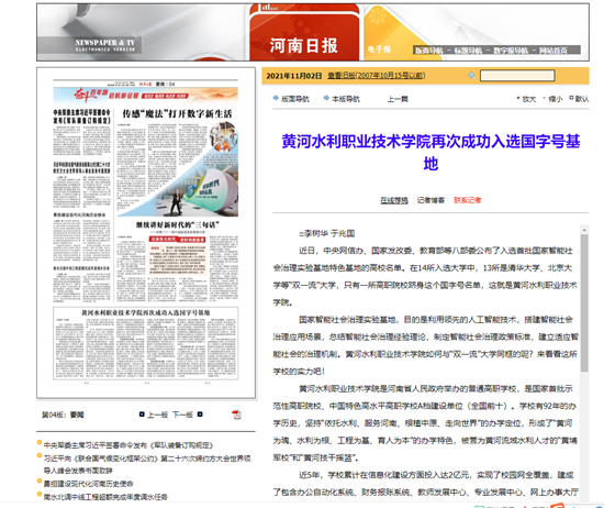 河南日报:黄河水利职业技术学院再次成功入选国字号基地
