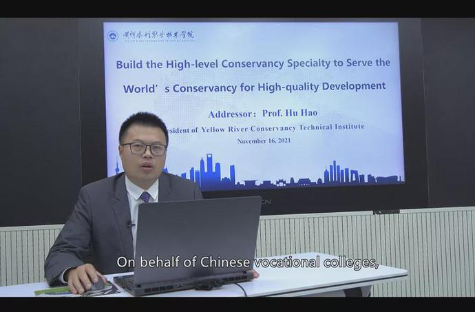 胡昊以《打造水利类高水平专业群,服务世界水利高质量发展》为题做主旨发言,介绍了学校在水利类专业建设过程中的探索与实践。一是面向现代水利,优化专业机制。水利类专业经过90多年的发展,已涵盖水利水电建筑工程、水利工程运行与管理等10多个专业和方向,形成优势互补和资源共享的专业融合机制。二是制定标准方案,引领行业发展。学校牵头、主持了全国水利大类的专业标准和资源建设;主持制定全国高职水利水电建筑工程专业的“两标准一方案”、《国家职业大典》中水利行业7个工种职业标准。三是搭建技术技能创新平台,支撑水利人才培养。学校建设有国家智能社会治理实验基地、国家级职教示范性虚拟仿真实训基地,拥有多个省级工程技术研究中心和市级重点实验室,形成市-省-国三级技术技能创新平台矩阵。四是依托大禹学院,打造国际教育品牌。学校先后在赞比亚、南非建立海外分校大禹学院,针对当地水利行业发展情况和人才需求开发专业标准,培养当地急需的技术技能人才,为“一带一路”沿线国家贡献了黄河水院智慧。五是开展国际认证,对接世界标准。学校与英国国家学历学位评估认证中心合作进行水利水电建筑工程等专业的国际评估认证工作,涉及领域包括资历框架建设、职业国际资格证书开发等,致力于打造国际认可的专业标准、教学标准和教学资源。