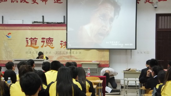 讲堂在《啊,母爱》的深情朗诵中拉开了序幕。“妈妈,我爱你”,在场师生观看了学生们自己拍摄的视频《对母亲说的一句话》,将一直以来不好意思开口的感恩、最真挚的语言,通过视频的方式告诉妈妈。大家畅谈了对父母多年养育恩情的感想,大家分享了一段温暖的动画短片,从呱呱坠地、牙牙学语到成家立业,每一步成长,父母都倾注了大量的心血。学生们排演的话剧《妈*的谎言》,震撼心灵,同学们感触良多,深切体会到自己应该怎样去践行孝道文化,感恩父母。师生集体诵读经典《论语》、《弟子规》,感受中华民族传统孝道文化的深厚内涵,激发大家学习传统文化,传承中华美德的动力和热情。感动之余,现场学生们纷纷发表感悟,表示要感恩父母,力尽孝道。最后,师生共同做出庄严承诺,齐唱《懂你》之歌,并在写有“赞颂母爱光辉,传递道德能量”的横幅上签名,表达感恩父母之情,力尽孝道之心。