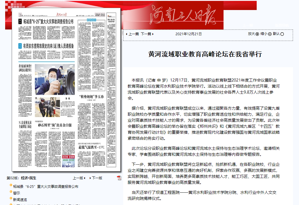 本报讯(记者 申 梦)12月17日,黄河流域职业教育联盟2021年度工作会议暨职业教育高峰论坛在黄河水利职业技术学院举行。活动以线上线下相结合的方式开展,黄河流域职业教育联盟代表以及关心支持教育事业发展的社会各界人士9.8万人次线上参会。