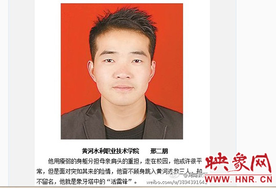 邢二朋简介:邢二朋,男,鹤壁浚县人,2013518日下午邢二朋与同学骑自行车来到黄河柳园口段郊游,三入黄河救助落水儿童,因此受到社会称赞和表彰。