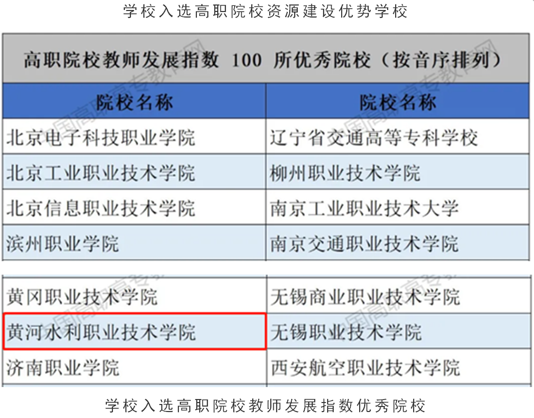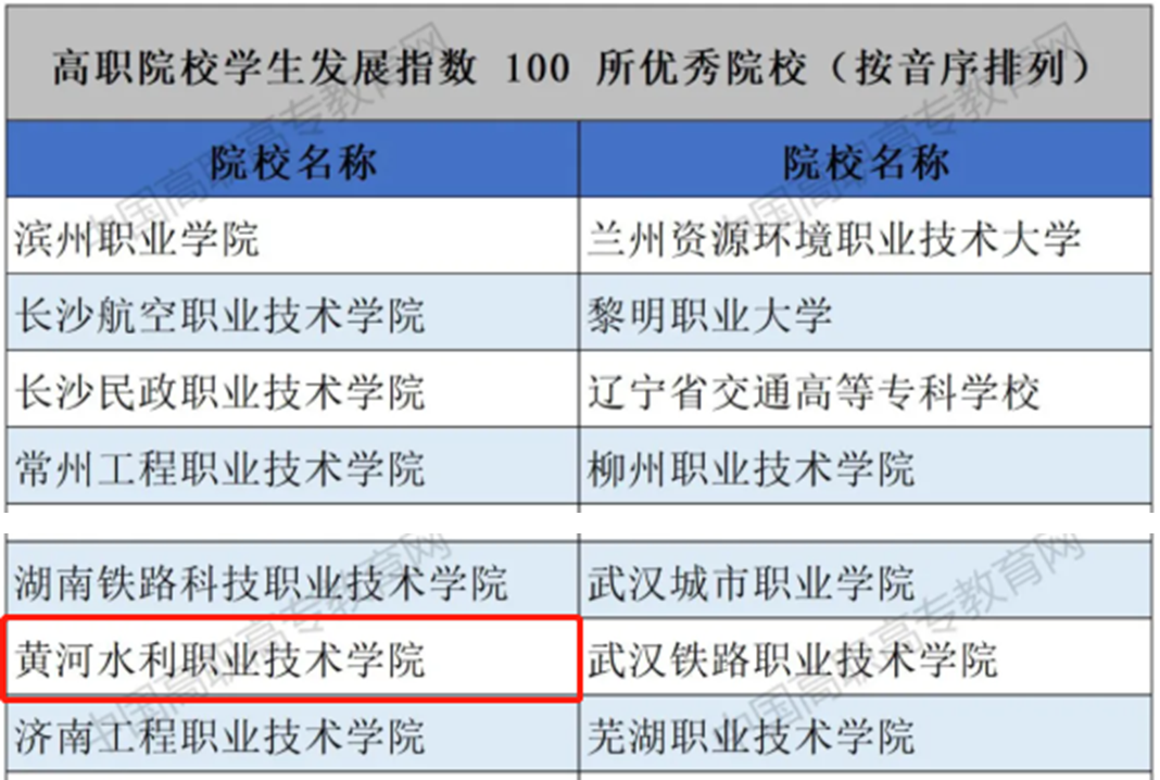 近日,中国教育科学研究院、全国职业高等院校校长联席会议编制的《2021中国职业教育质量年度报告》由高等教育出版社出版并正式发布。黄河水利职业技术学院以优异成绩入选“高职院校学生发展指数优秀院校”(全国共100所)、“高职院校资源建设优势学校”(全国共60所)“高职院校教师发展指数优秀院校”(全国共100所),标志着学校综合办学实力和社会影响力的显著提升,是学校在“十四五”开局取得的一项重要成果。