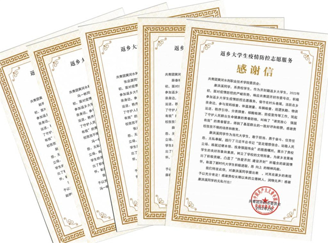 本网讯 2022年初,我省面临新冠疫情防控形势严峻复杂,防控工作进入胶着对垒的关键时刻。为应对严峻形势,充分发挥青年学生的生力军和突击队作用,黄河水利职业技术学院团委积极引导团员青年向居住地社区(村)报到,在做好自身安全防护的前提下,依法科学有序参加疫情防控志愿服务工作。近日,黄河水利职业技术学院收到共青团开封市委员会、五陵镇人民政府、泌阳县马谷田镇人民政府等发来的感谢信,对黄河水利职业技术学院返乡大学生疫情防控志愿者给与鼓励和肯定。