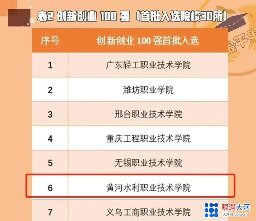 “创新创业100强”全国首批入选30所高职院校 黄河水院位列第6名
