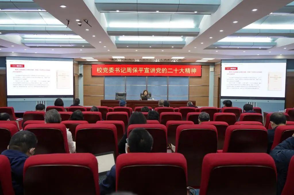 周保平以“一个主题、一个中心任务、三件大事、四个方面里程碑意义、两个结合、六个坚持、中国式现代化五个特征、三方面重点工作、两个全面、五个必由之路”等十个关键词语为切入点,围绕“精研细学,深刻认识党的二十大重大意义;学深悟透,准确把握党的二十大精神实质;细照笃行,办好人民满意的高职教育;勇担使命,争做堪当民族复兴大任的时代新人”等四个方面,以生动鲜活的语言、丰富翔实的资料,全面、准确、完整阐释了党的二十大精神,对党员干部和广大师生提出了期望和要求。