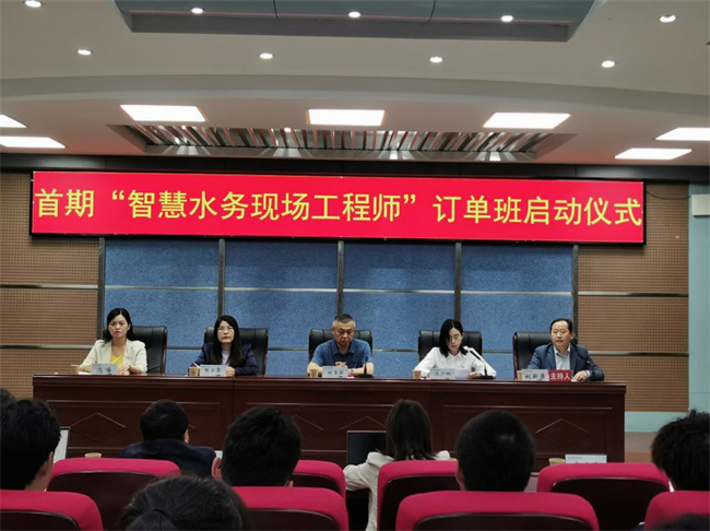 本网讯 5月25日上午,黄河水利职业技术学院-北控水务集团有限公司首期“智慧水务现场工程师”订单班启动仪式在该校三号实训馆3楼学术报告厅隆重举行。学校副校长刘玉宾、北控水务集团东部大区副总经理马少娜出席仪式,学校教务处处长陶永霞、环境工程学院院长冯峰及相关领导、订单班全体学生参加本次仪式。仪式由环境工程学院副院长姚新鼎博士主持。