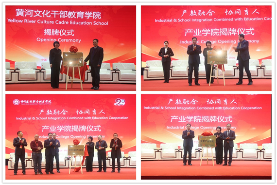 会上,黄河水院党委书记许琰、校长祝玉华为黄河文化干部教育学院揭牌,并分别与三门峡黄河明珠(集团)有限公司董事长贺树明,与武汉航天远景科技股份有限公司总裁高凯、广州南方测绘科技股份有限公司副总经理郭宝宇、广州中海达卫星导航技术股份有限公司副总裁胡炜、上海华测导航技术股份有限公司副总裁赵利平、北京超图软件股份有限公司助理总裁刘宏恺,与南京第55所技术开发有限公司总经理余云峰,举行了黄河明珠产业学院、时空大数据产业学院、云智产业学院揭牌仪式