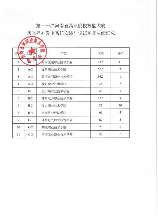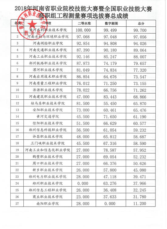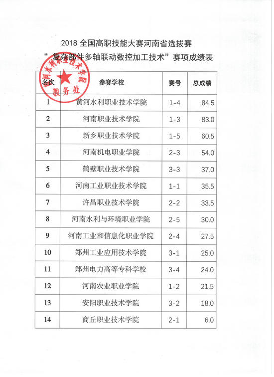 4月6—8日,第十一届河南省高职院校技能大赛暨2018年全国职业院校技能大赛高职组河南省选拔赛“工程测量”、“风光互补发电系统安装与调试”、“复杂部件数控多轴联动加工技术”等3个赛项在我校举行。现将成绩予以公示。