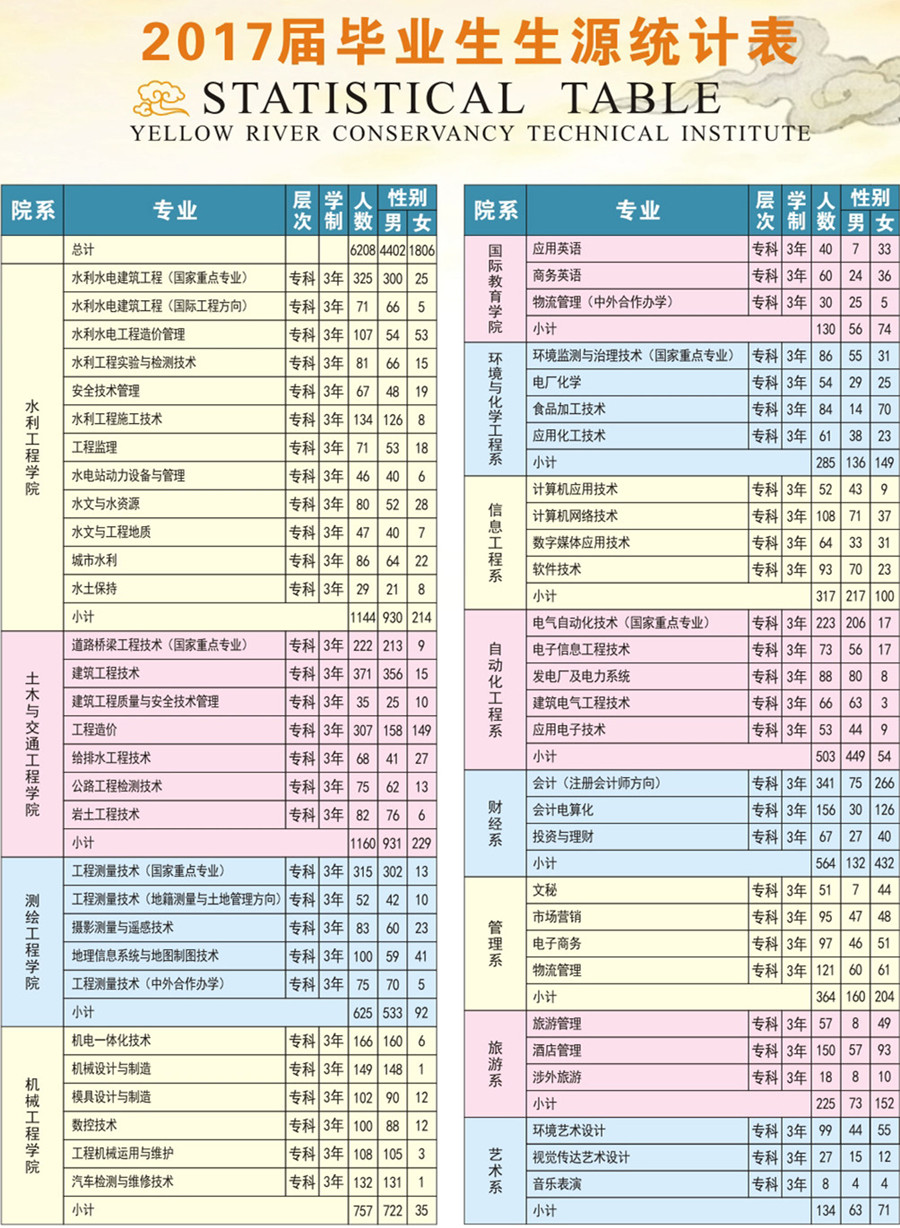 黄河水利职业技术学院是全国首批28所国家示范性高等职业院校,坐落在历史文化名城、中国优秀旅游城市河南省开封市,具有87年的办学历史,10万余名毕业生在各行各业做出了贡献,受到社会和企业的欢迎。2017届普通专科毕业生6208人,涵盖水利、测绘、土木、机械制造、电子信息、环保与安全、化工技术、电力技术、计算机、食品、财经、管理、旅游、语言文化、艺术设计等15类59个专业及专业方向,生源分布全国27个省(市)。
