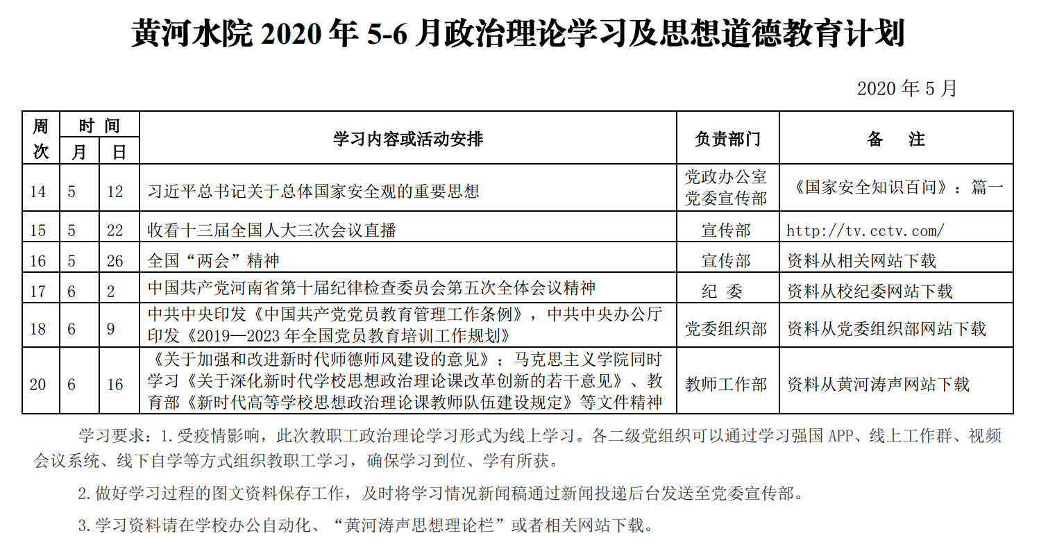 黄河水院2020年5-6月政治理论学习及思想道德教育计划