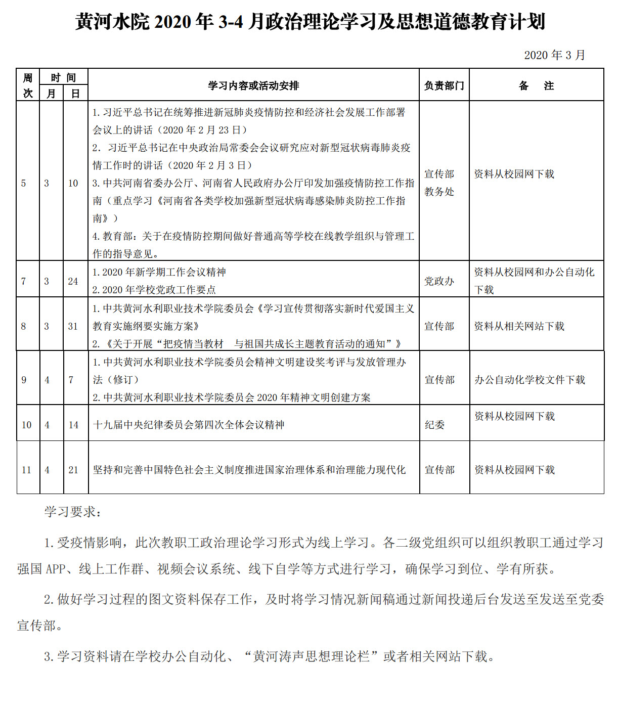 黄河水院2020年3-4月政治理论学习及思想道德教育计划